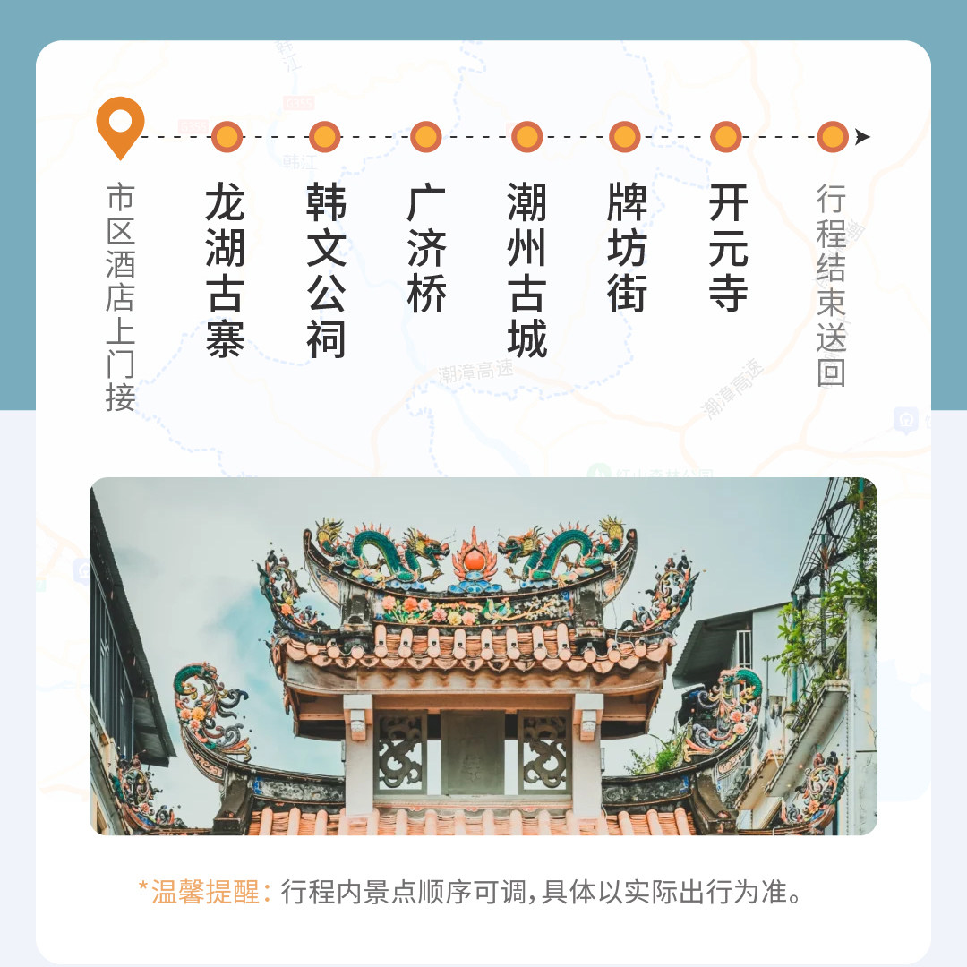 本线路支持单人预订,完美契合差旅中临时起意或独自出行的需求。无需拼团等待,随时成行,特别适合在潮汕地区出差的商务人士利用半日或一日空闲,深入探访潮州古城的历史肌理,在牌坊街品工夫茶、于广济桥赏韩江风光,实现工作与休闲的无缝切换。