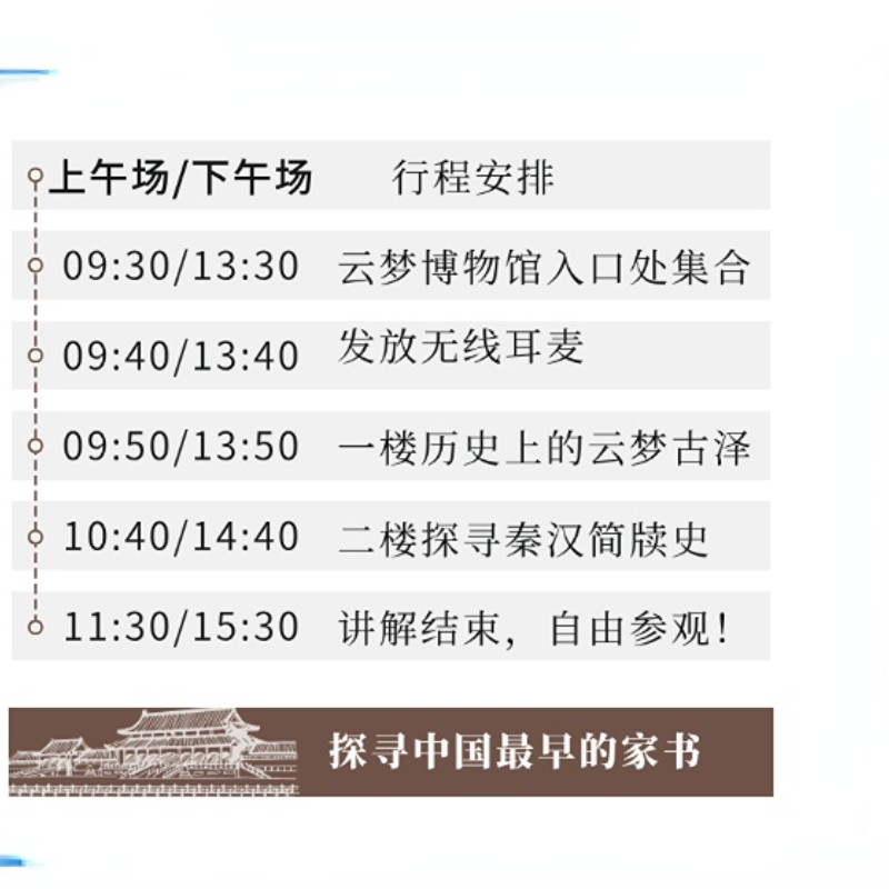 无需拼团、不设最低成行人数,本产品支持单人预订,特别适合独自出差的商务人士。在孝感短暂驻留期间,利用午休或下午空档,走进祥山博物馆,在专业导览下快速掌握云梦地区的历史脉络。全程半日安排,不打乱原有差旅行程,却能收获一段有深度的文化休憩时光,让差旅不再只是奔波。