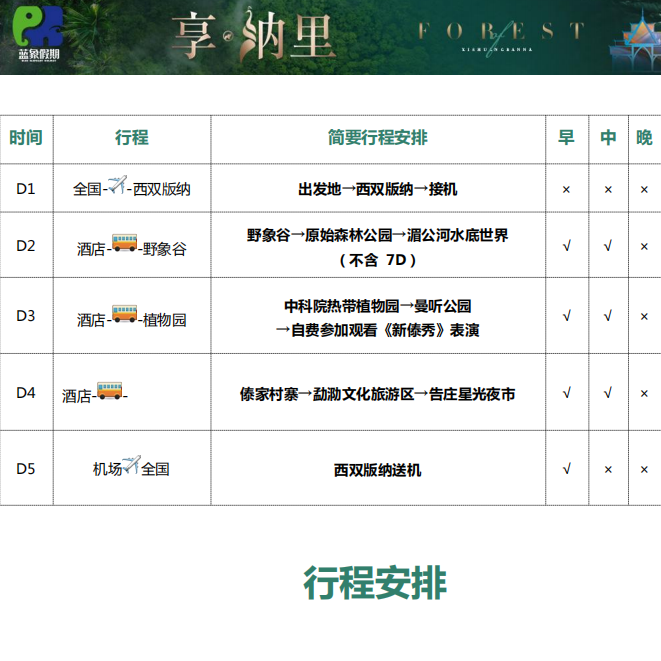 针对商务人士有限的休假窗口,本产品采用5天4晚黄金时长设计,最大化利用周末+2天年假即可完成全程。行程节奏张弛有度,白天探索雨林、村寨,夜晚漫步夜市、休憩养生,避免舟车劳顿。从全国主要城市出发当日可达,返程亦可衔接晚间航班,确保周一准时返岗,真正实现“短假高质”的差旅度假平衡。