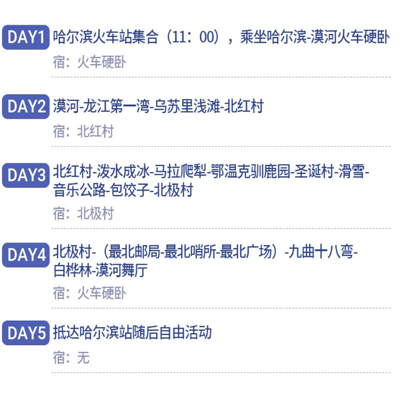 本线路支持1人独立成团,无需拼团等待,极大提升了差旅人士的时间灵活性。对于经常出差或临时有假期的商务旅客而言,这种‘随订随走’的机制非常友好。从哈尔滨出发,深入漠河、北红村、圣诞村等目的地,全程安排卧铺往返,节省白天时间,让差旅与度假无缝衔接。无论是年末冲刺后的奖励旅行,还是年假中的短途放松,都能轻松实现。