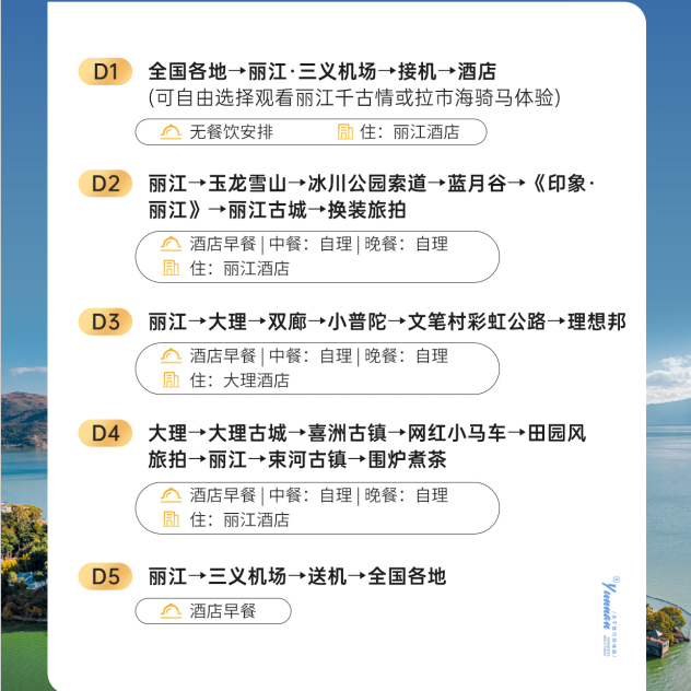 行程设计精准匹配差旅人士常见的休假模式:利用周五下午或周六早班机出发,结合3天年假即可完成整段旅程。5天时间足够深度游览丽江古城、玉龙雪山、大理洱海等核心景点,又不会过度占用工作日,是高效利用碎片化假期的理想方案。