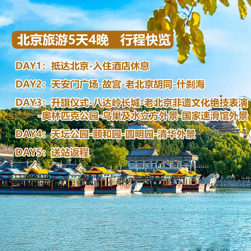 行程起点与终点均为北京本地,特别适合在京出差或常驻人士。无需额外安排往返大交通,节省时间与费用,可直接从办公地点或酒店出发参团。5天4晚设计合理,既能深度游览主要景点,又不影响正常工作节奏,是本地差旅人群轻松度假的理想选择。