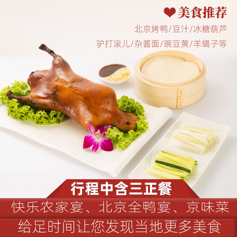 差旅不止看风景,更要品地道风味。本行程特别安排正宗北京全鸭宴,精选优质烤鸭,皮酥肉嫩、香气四溢,搭配传统吃法,尽享京味精髓。途中还可品尝街头经典小吃冰糖葫芦,酸甜开胃,唤起童年回忆。美食与文化双线并行,让您的差旅假期更有“京”彩。