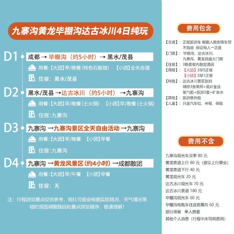 本线路支持1人独立成团,无需拼凑人数,特别适合商务人士或独自出差后想放松身心的旅客。从成都出发,4天3晚紧凑安排九寨沟、黄龙、达古冰川与毕棚沟四大世界级自然景区,行程高效不拖沓,既满足差旅后的休闲需求,又节省宝贵时间,真正实现‘工作结束即度假’的无缝衔接。