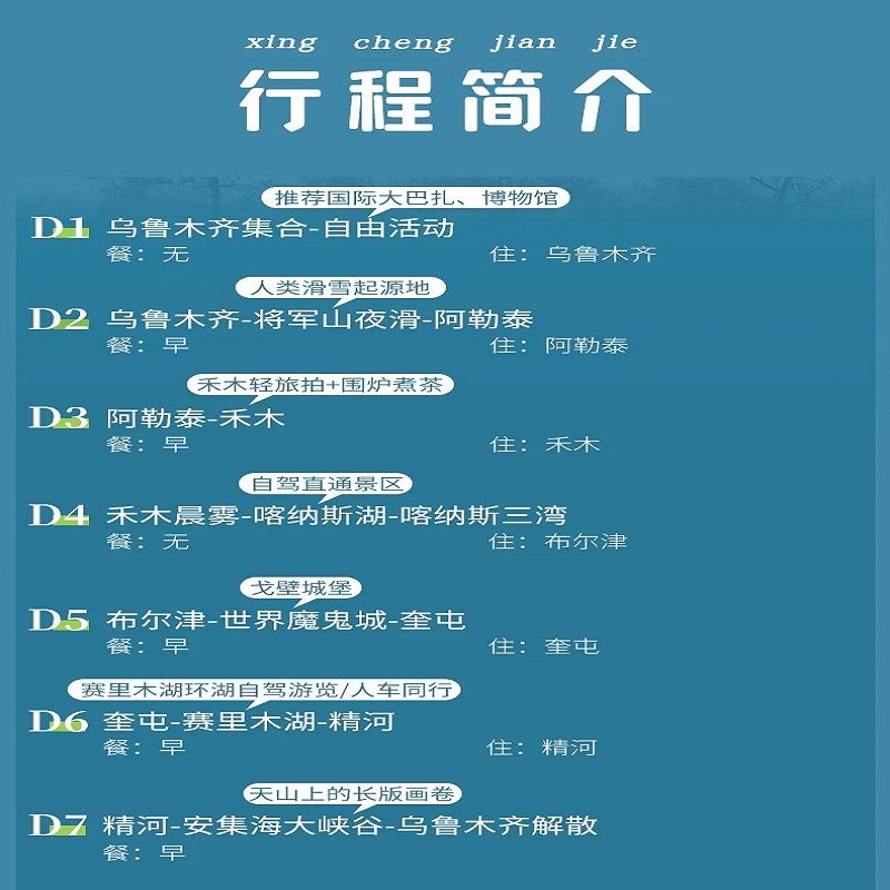 本行程专为商务与休闲兼顾的差旅人士设计,支持1人独立成团,无需拼团等待,极大提升出行效率。无论您是临时出差后顺道度假,还是独自探索北疆风光,都能即订即走。从乌鲁木齐出发,深入阿勒泰、喀纳斯等核心景区,7天6晚行程紧凑而不仓促,完美契合差旅人群对时间精准把控的需求,让您的假期与工作无缝衔接。