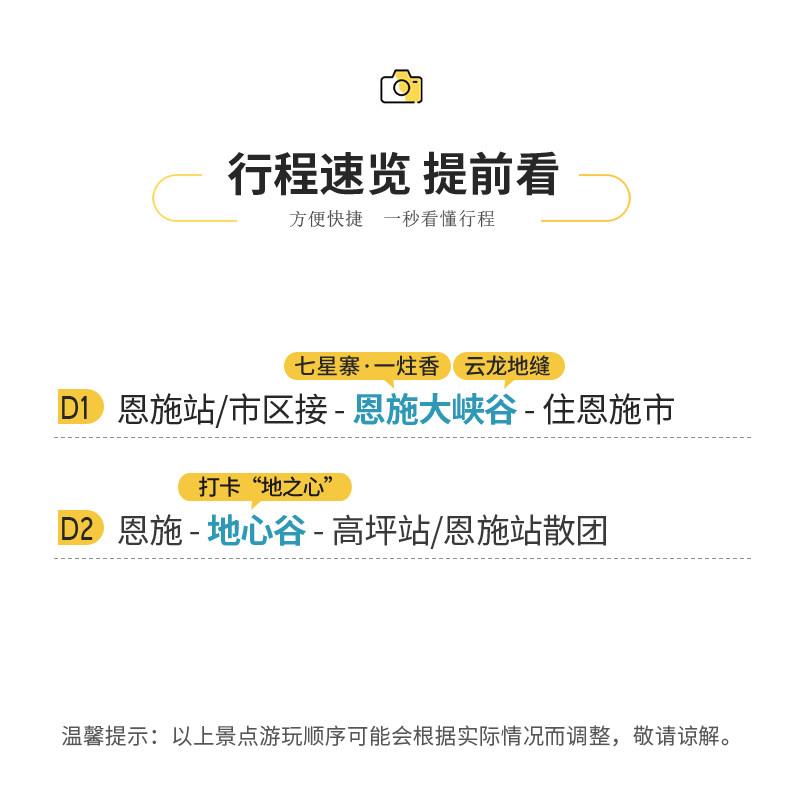 精心规划的2日行程完美适配周五下班后出发、周日晚返程的差旅节奏,或利用3天小长假中的核心两天。无需请长假,即可完成一次深度自然之旅。行程安排张弛有度,白天游览、晚上休整,确保不影响后续工作状态,是高效利用碎片化假期的理想选择。