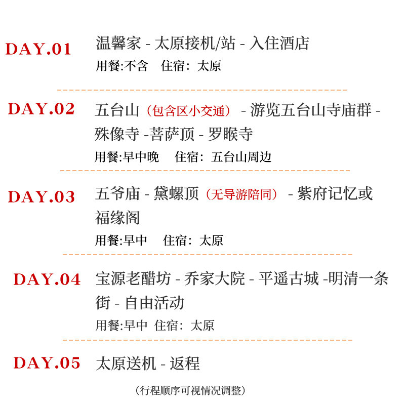 本线路支持单人报名参团,无需拼团等待,特别适合商务人士或独自出差后希望顺道放松身心的旅客。无论您是临时调休、会议结束后的短途休整,还是独自出行寻求宁静,这条5天4晚的山西祈福之旅都能无缝衔接您的差旅节奏,省去组织团队的繁琐,让旅程说走就走,高效又从容。