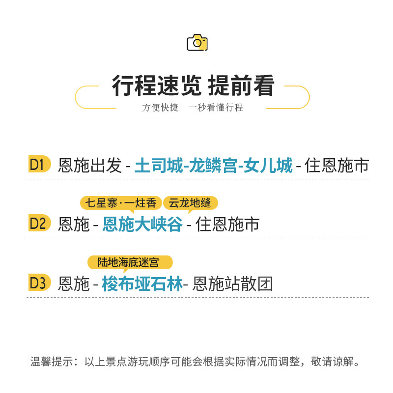 利用周末或项目间隙的3天时间,即可完成一次高品质的深度度假。行程节奏张弛有度,既有大峡谷的惊险栈道徒步,也有女儿城的夜市慢生活,完美适配差旅人群对‘短时高效、内容充实’的休闲需求,让短暂假期不虚此行。