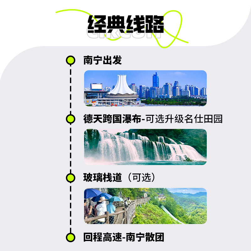 专为差旅人士设计的南宁至崇左一日游线路,完美融合高效交通与深度体验。从南宁市区便捷出发,全程含接驳车服务,节省您宝贵的时间成本。行程覆盖德天跨国瀑布与明仕田园两大核心景区,既能感受亚洲第一跨国瀑布的壮丽气势,又可在田园风光中短暂放空身心,实现商务出行与自然疗愈的无缝切换,是出差途中理想的微度假选择。