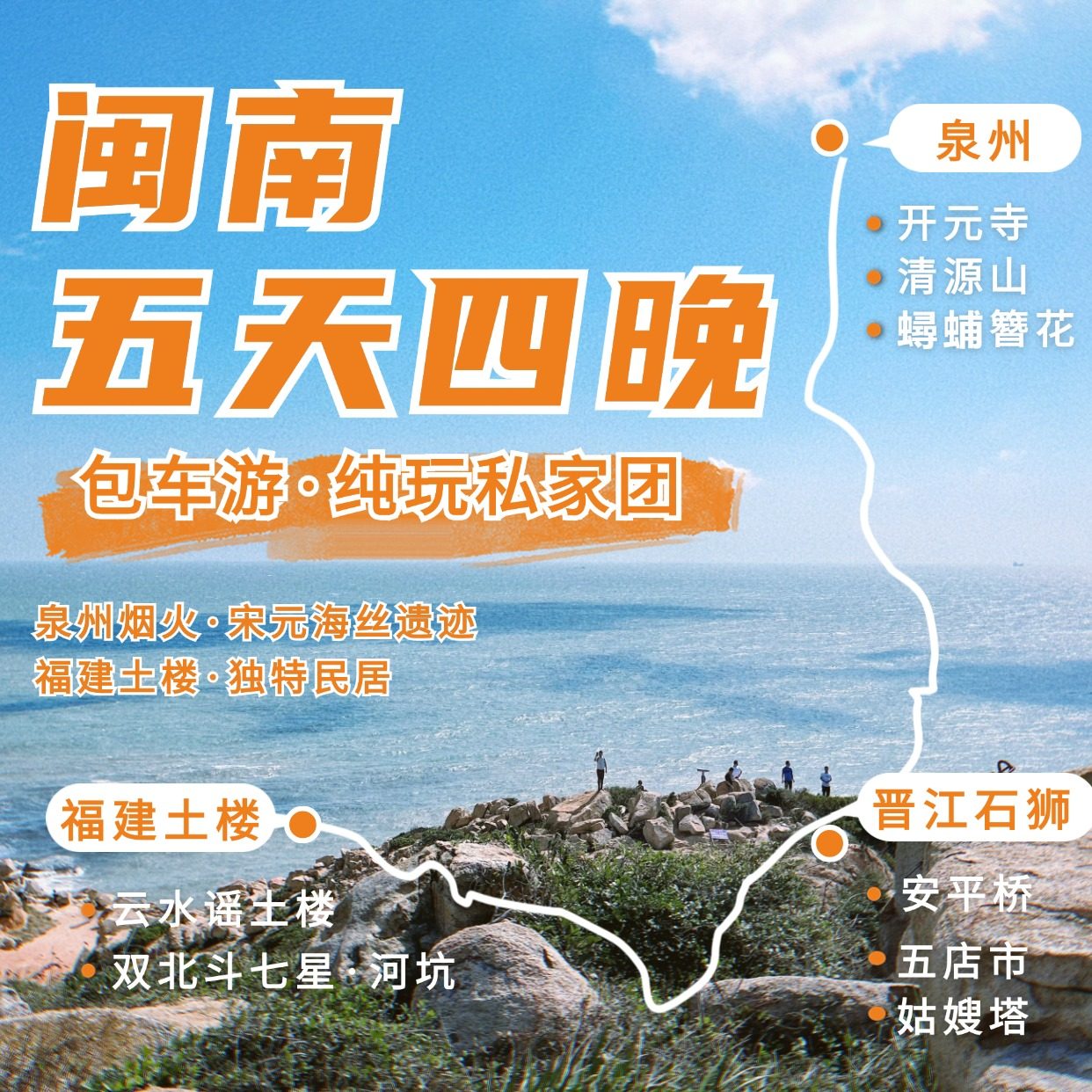 从厦门出发,仅需短途车程即可抵达漳州与泉州,形成高效便捷的闽南金三角差旅动线。本行程专为商务人士或结伴出行者设计,兼顾工作与休闲节奏,5天4晚安排紧凑却不仓促。您可在厦门完成公务后无缝衔接文化之旅,探访云水谣古镇、河坑土楼群、开元寺簪花体验等特色项目,实现差旅与度假的完美融合,让每一次出行都兼具效率与深度。