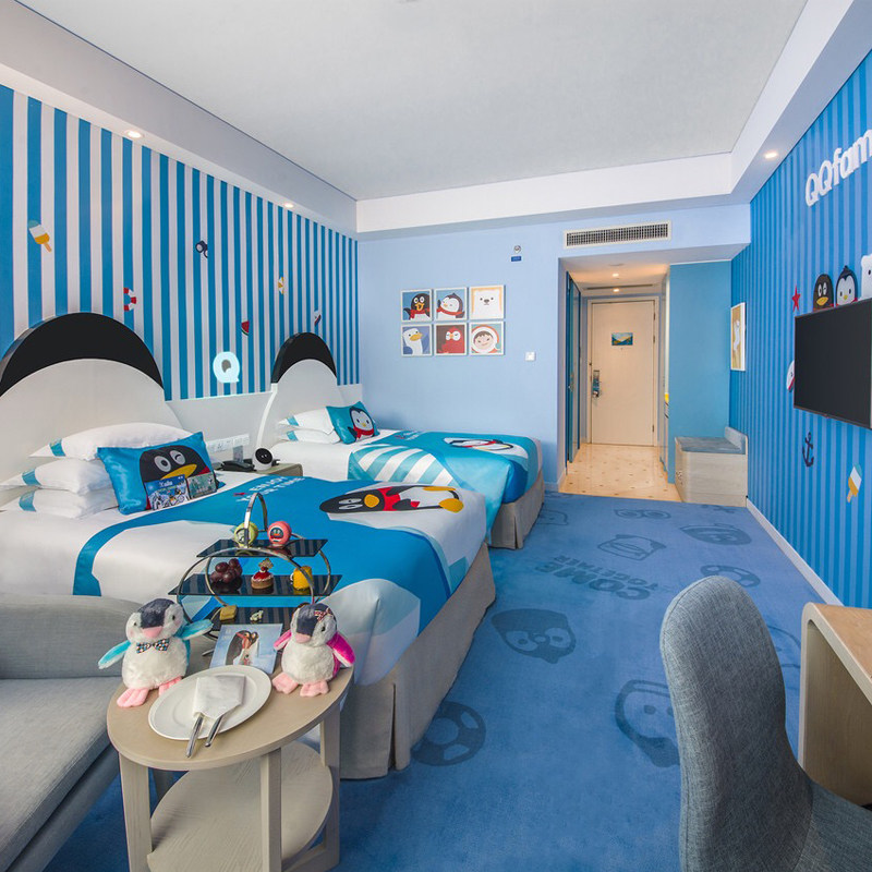 针对带娃出差的家庭,酒店提供精心设计的亲子主题房,配备企鹅公仔及定制儿童洗漱套装,从细节呵护孩子旅途舒适度。房间布局兼顾成人休憩与儿童活动空间,让家长在完成工作任务之余,无需额外操心孩子用品准备。这种“一站式”服务极大减轻差旅负担,提升全家出行满意度。