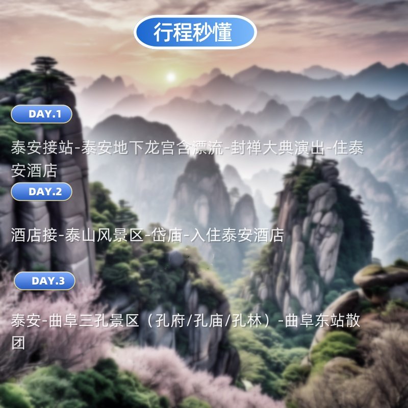 本行程专为兼顾差旅与度假需求的旅客设计,将山东泰安与济宁两大文化重镇串联。您可在公务之余登临五岳之首泰山,感受帝王封禅的庄严历史;随后探访曲阜“三孔”(孔庙、孔府、孔林),沉浸于儒家文化的千年传承。全程安排紧凑高效,适合1人单独出行或小团队差旅后顺道度假,既满足商务节奏,又不失文化滋养。