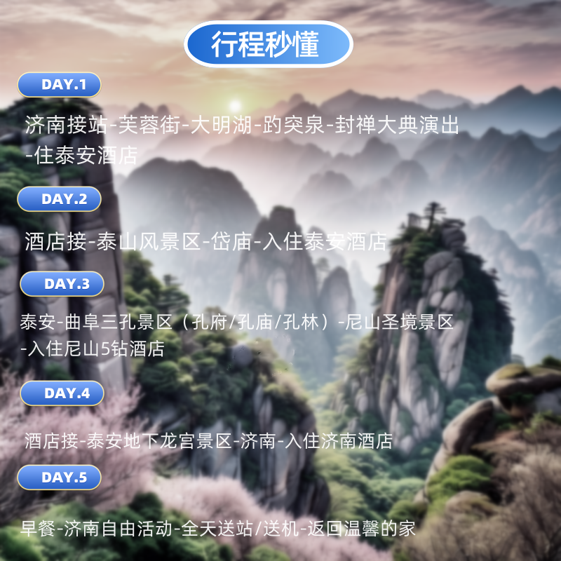 本行程专为差旅人士设计,采用“济进济出”闭环路线,极大节省往返交通成本与时间。从济南出发,依次覆盖泰安(泰山)、济宁(曲阜、尼山)等山东文化重镇,全程无需中转奔波,适合公务出差后顺道度假或利用周末拼假深度体验。5日4晚节奏张弛有度,既满足高效出行需求,又融入丰富人文体验,让差旅与休闲无缝衔接。