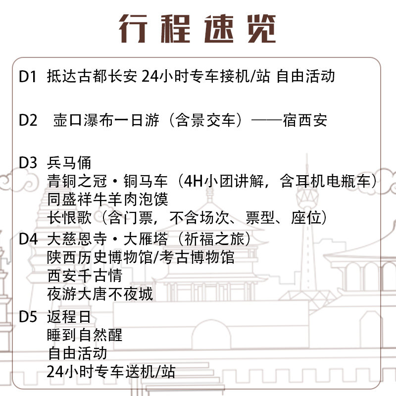 5日4晚的行程长度精准匹配大多数差旅人士的周末+年假组合或项目间隙窗口。从西安或天津出发,无需额外请假即可完成一次深度文化度假。行程节奏张弛有度,既有兵马俑、壶口瀑布等重磅景点,也预留自由探索时间,确保您在高效完成商务任务的同时,充分享受假期应有的松弛与愉悦。