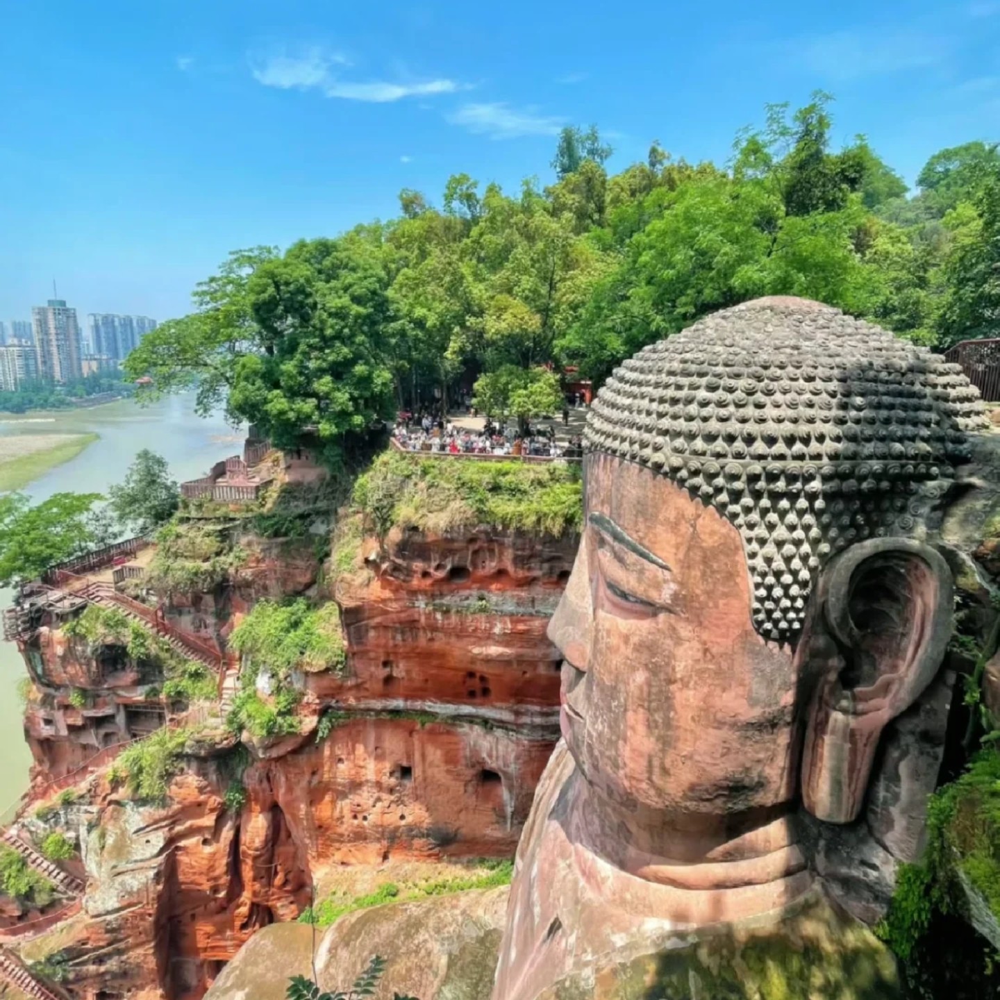 为差旅人士提供多维文化体验——既可乘船从江面仰视乐山大佛的恢弘气势,感受“山是一尊佛,佛是一座山”的震撼;也可选择登山步道近距离触摸千年石刻,细品唐代工匠的精妙技艺。双重视角不仅丰富了游览层次,更在有限时间内最大化文化收获,让短暂差旅也能满载人文记忆而归。