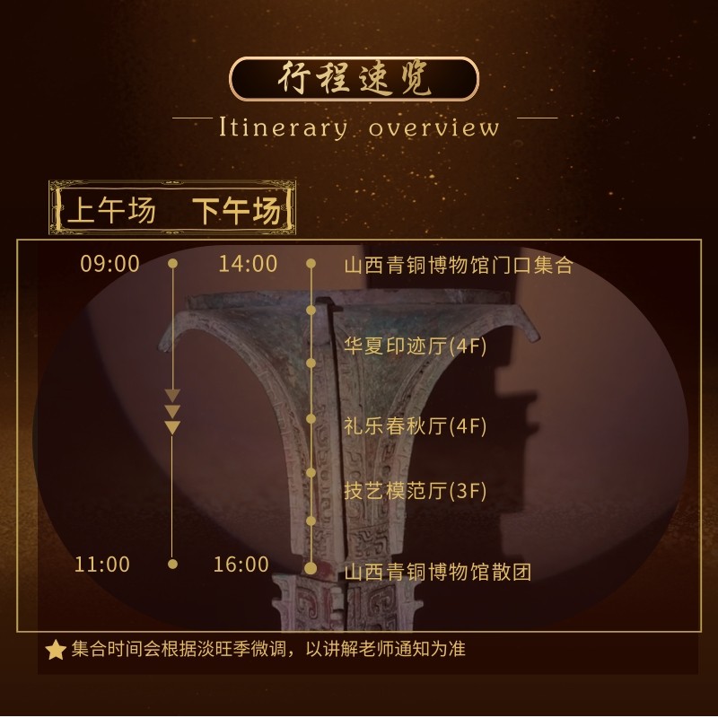 专为商务差旅人士设计,本行程仅需2小时即可深度游览太原青铜博物馆,由专业讲解员全程导览,精准提炼三晋青铜文明精华。无需耗费全天时间,轻松嵌入紧凑的差旅日程,在高效工作之余沉浸于三千年前的礼乐重器与铸造技艺之中,实现文化充电与行程效率的完美平衡。