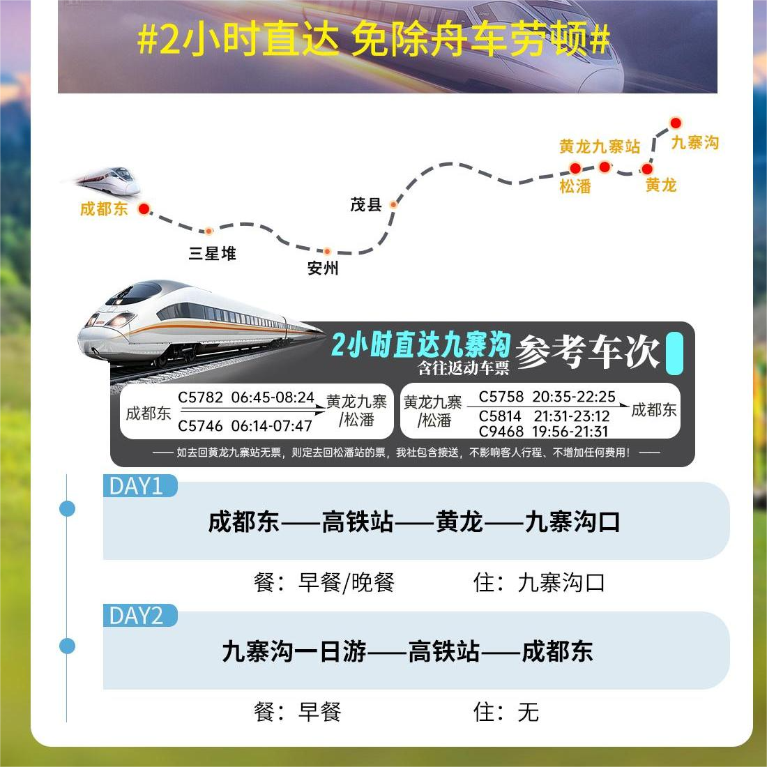 专为时间紧张的差旅人群定制2日精华行程:D1上午从成都出发,下午游览黄龙钙华奇观,夜宿九寨沟口;D2全天沉浸于九寨沟五彩池、诺日朗瀑布等绝美景观,傍晚返程。两天一夜紧凑而不仓促,充分利用周末或出差尾声,高效完成对世界自然遗产的深度体验,让短暂假期也充满高光时刻。