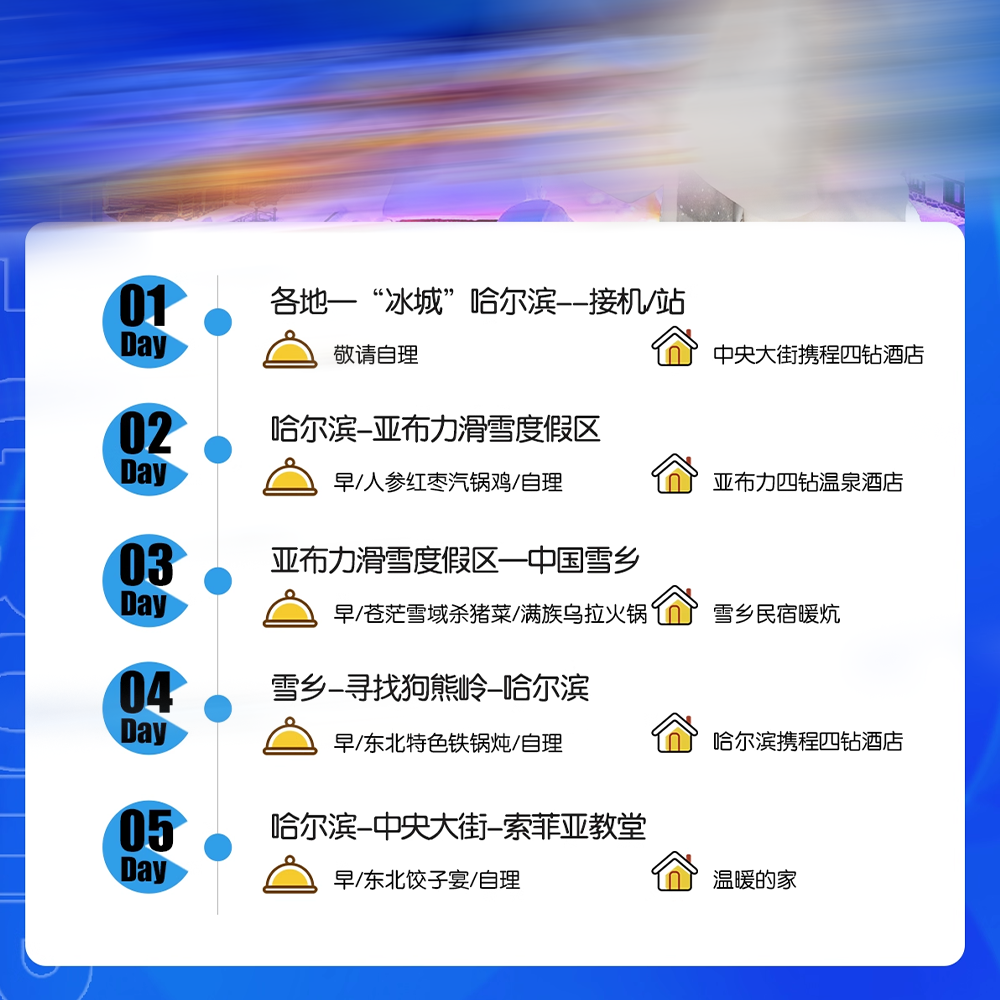 专为时间宝贵的差旅人群定制5天4晚行程,节奏张弛有度。前两日可处理远程工作或轻量会议,后三日沉浸式体验冰雪项目。行程涵盖哈尔滨市区观光、亚布力滑雪、雪乡夜景等精华内容,既满足工作需求,又不牺牲度假质量,真正实现‘工作度假两不误’。
