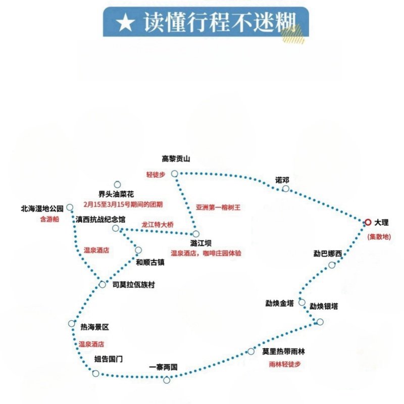 本行程支持1人独立成团预订,特别适合出差途中顺道放松或独自出行的商务人士。无需拼团等待,行程时间明确,7天6晚紧凑而不仓促,既能高效完成差旅任务,又能沉浸式体验云南大理、德宏、腾冲等地的自然与人文魅力,实现工作与休闲的完美平衡。