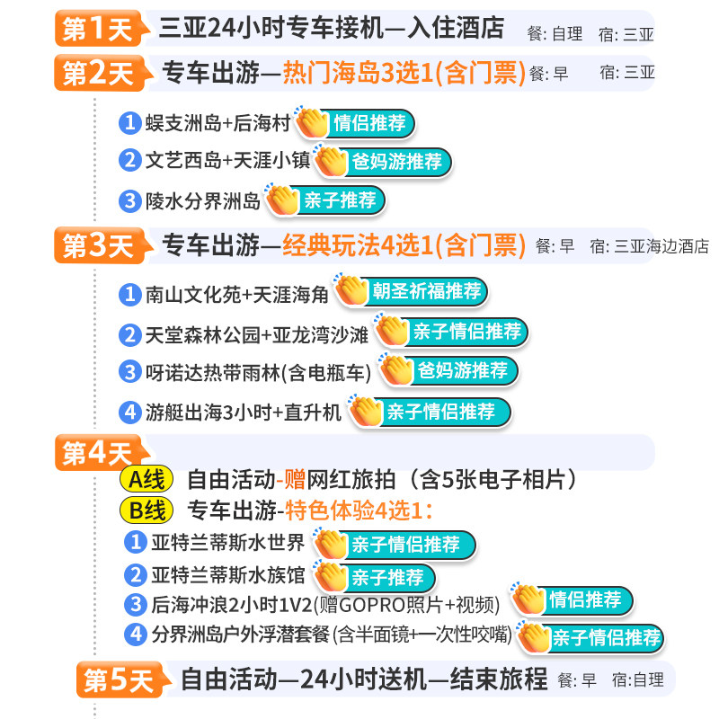 本行程支持1人单独预订,非常适合商务人士在差旅间隙灵活安排休闲度假。无需等待拼团,随时出发,节省宝贵时间。5天4晚的行程设计兼顾效率与放松,既可满足工作后的身心恢复需求,又能深度体验三亚的热带风情,是差旅融合休闲的理想选择。