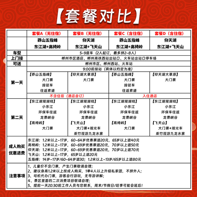 针对商务差旅人士时间紧凑、行程灵活的需求,本线路支持1人独立成团,无需等待拼团满员,随时可出发。郴州作为湖南南部交通枢纽,高铁与高速网络发达,便于从周边城市快速抵达。2日行程科学安排东江湖、高椅岭等核心景点,既满足高效游览,又兼顾身心放松,是差旅间隙理想度假选择。