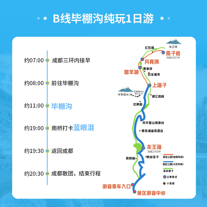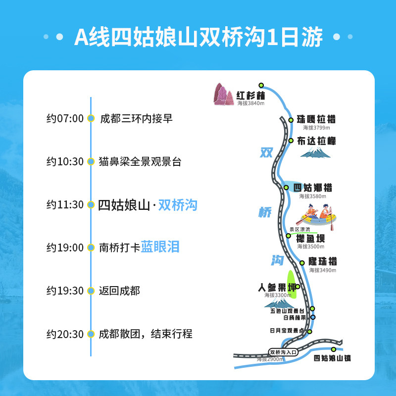 针对差旅人群对效率与便捷的高要求,本产品提供成都市区上门接送服务,免除打车、导航、停车等琐碎环节;同时包含毕棚沟、四姑娘山双桥沟等核心景区门票,无需现场排队购票。从出发到返程,全程安排妥当,让商务人士在短暂假期中彻底解放精力,专注于享受雪山美景与温泉疗愈,真正实现“说走就走”的差旅微度假体验。