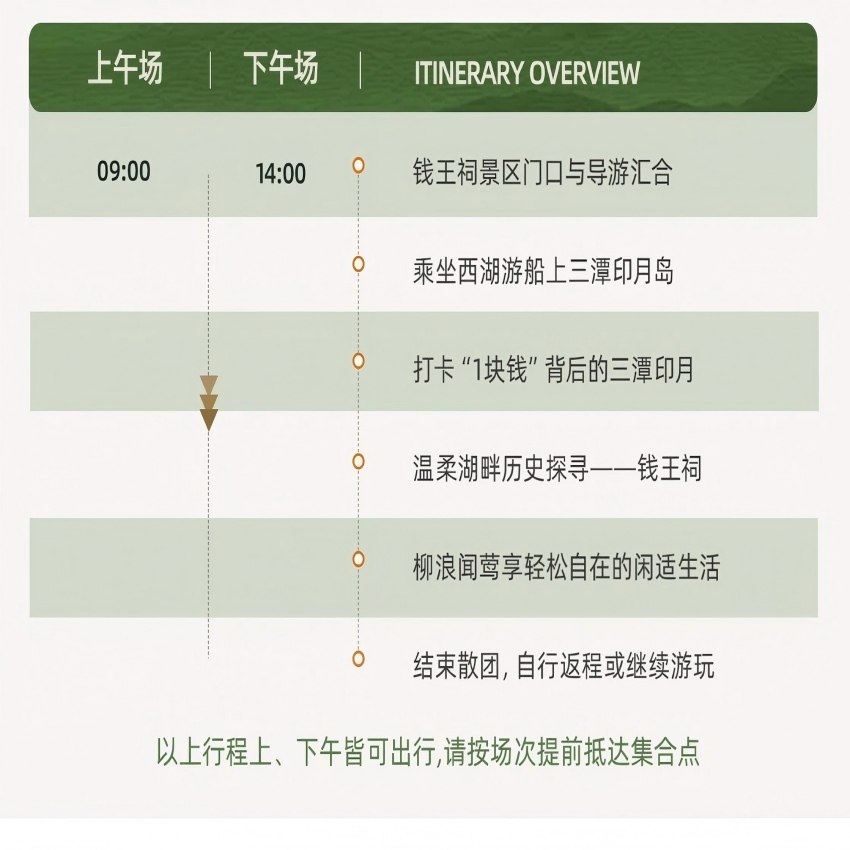 三潭印月作为人民币一元纸币背面图案,是极具辨识度的中国文旅IP;柳浪闻莺则是西湖十景中诗意盎然的代表。参与此行程,不仅能亲历这些标志性景观,还能收获高质量影像素材与文化故事,为商务社交场合增添话题亮点。无论是客户交流中的闲谈切入,还是社交媒体上的专业形象展示,都能体现您对目的地文化的尊重与品位。