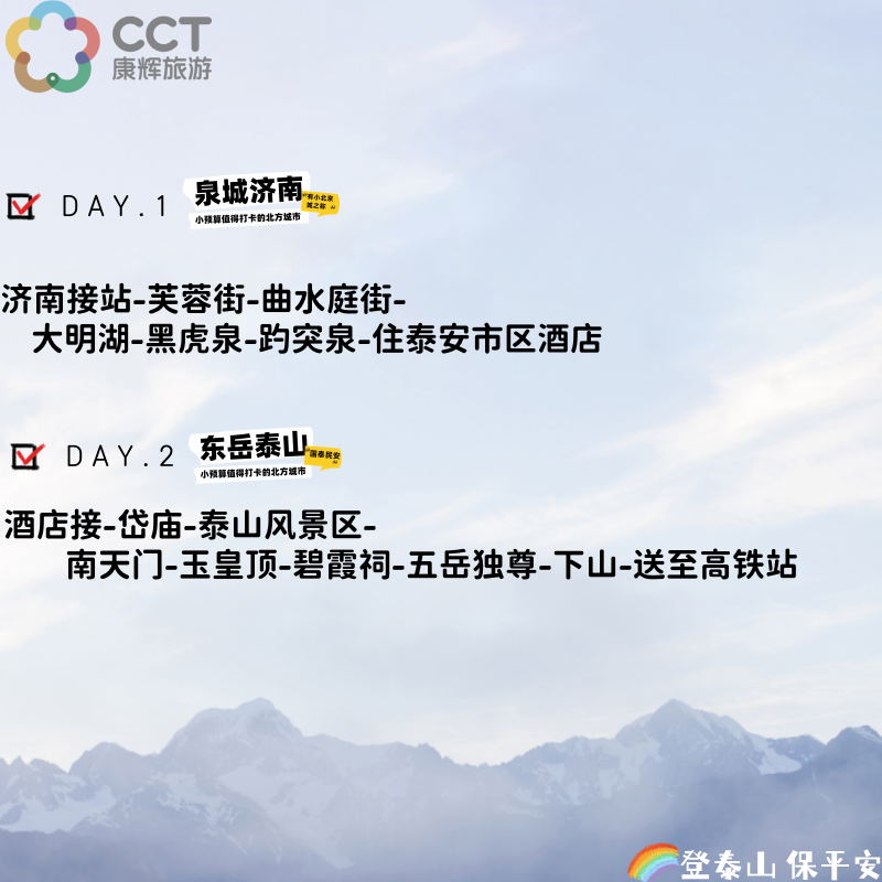 本行程专为差旅人士设计,巧妙串联济南与泰安两大山东核心城市,实现高效出行与深度度假的完美融合。从济南出发,可快速抵达世界文化与自然双遗产——泰山,单程车程仅1小时左右,极大节省交通时间。无论是结束商务会议后登高望远,还是在差旅间隙泡温泉放松身心,都能无缝切换状态。2天1晚紧凑安排,兼顾效率与体验,让您的出差之旅兼具生产力与治愈力。
