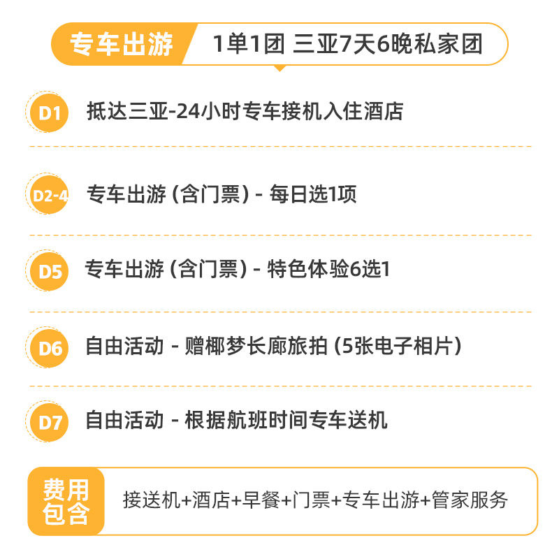 本行程专为2人设计私家团模式,非常适合差旅人士在公务之余享受高品质度假体验。无需拼团等待,行程节奏可自主掌控,既能高效完成工作安排,又能沉浸于三亚的热带风情中。全程纯玩无购物,确保时间利用最大化,是商务差旅与休闲度假的理想结合方案。