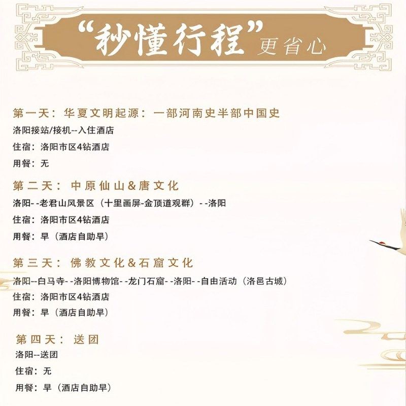 行程精心规划4天3晚,覆盖老君山、龙门石窟、白马寺、洛阳博物馆四大核心目的地,路线顺而不绕,节省交通时间。特别适合周末或短假期出差顺带度假的旅客,最大化利用碎片时间,实现高效差旅与深度旅游的无缝衔接。