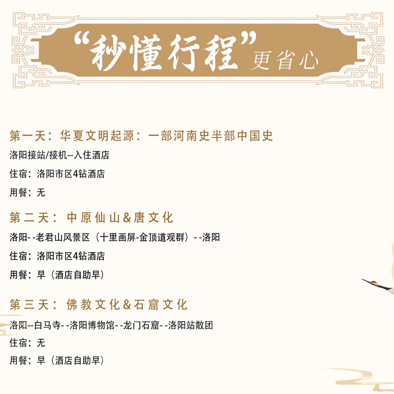 本行程专为兼顾差旅与度假需求的旅客设计,采用16人以内精品小团模式,确保出行高效、服务贴心。无论是独自出差后顺道放松,还是团队考察间隙体验文化,三天两晚紧凑而不仓促的安排,涵盖老君山、龙门石窟、白马寺等核心景点,交通、门票、讲解一价全含,节省您在差旅途中反复协调琐事的时间,真正做到“出差即度假”。
