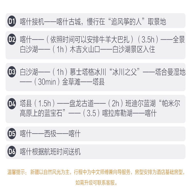 精心规划的6天5晚行程,巧妙融合喀什古城、帕米尔高原、白沙湖及中国西极等核心景点,节奏张弛有度,适合在差旅任务完成后无缝衔接一场文化沉浸之旅。每日车程合理安排,避免过度疲劳,确保您既能高效完成公务,又能充分领略南疆壮美风光与多元人文魅力。