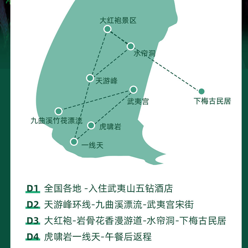 本产品以南平为起止点,实现‘家门口’的度假闭环。对于在福建南平及周边地区出差的商务人士而言,无需额外安排大交通,节省转乘时间和成本。结束工作会议后即可无缝切换至度假模式,4天3晚的紧凑安排最大化利用碎片化假期,真正实现‘说走就走’的差旅微度假。