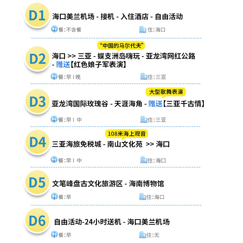 产品包含出发地至海口/三亚的往返机票,价格全包,避免差旅报销繁琐流程。对于企业客户而言,此举有助于统一预算管理;对个人而言,则省去比价购票的时间成本。航班时段经优化匹配,尽量安排白天抵达,最大化利用假期时间,让6天行程真正物超所值。
