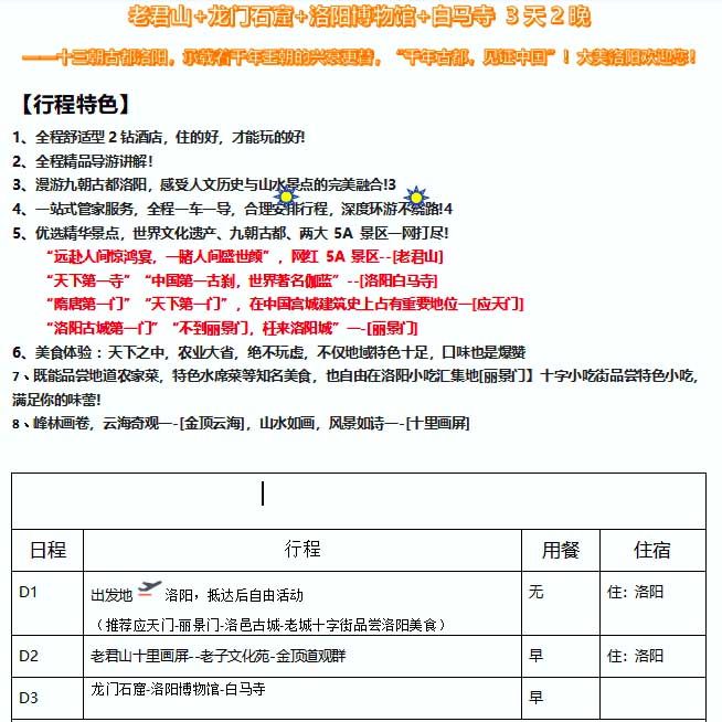 行程精心压缩在3天2晚内,既满足短假或周末差旅后的休闲需求,又不耽误返程工作安排。第一天下午抵达即可开启文化探索,第二天全天游览老君山,第三天上午参观龙门石窟与白马寺后返程,节奏张弛有度。这种紧凑而不仓促的设计,让有限的差旅空档发挥最大旅游价值。