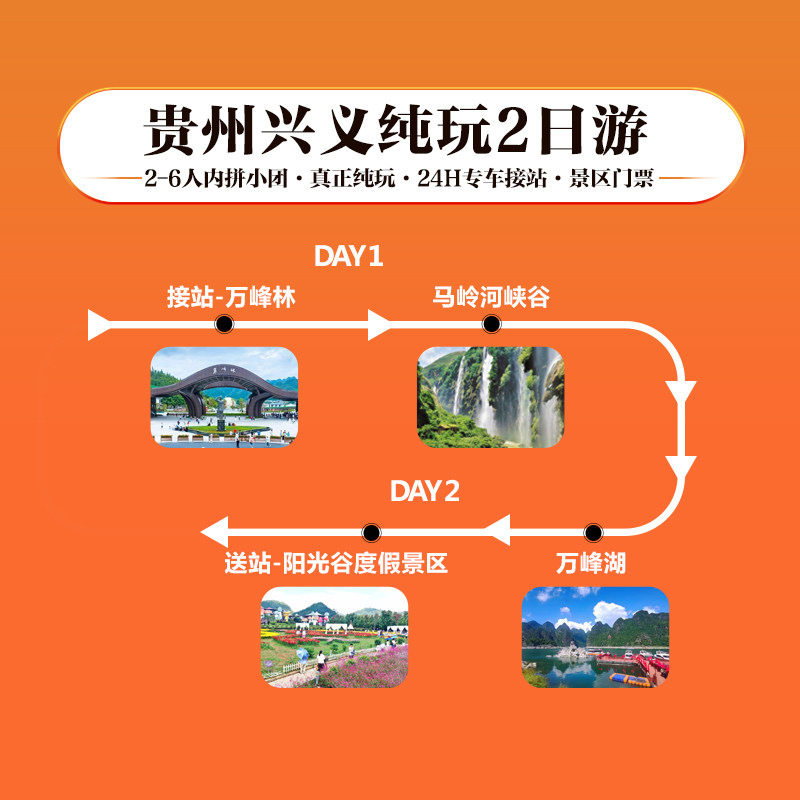本产品支持1人单独预订,无需拼团等待,特别适合临时出差或独自出行的商务人士。在完成工作之余,可快速切换至度假模式,2天1晚的紧凑行程设计兼顾效率与放松,无需协调多人时间,极大提升差旅期间的休闲自由度,让您的黔西南之行说走就走、轻松无忧。