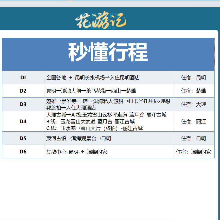 考虑到差旅人士假期有限但追求深度体验,本产品精心压缩行程至6天5晚,涵盖昆明春城风光、大理白族文化与丽江纳西风情。每日安排主次分明,上午集中游览核心景点,下午预留自由活动或远程办公时间。住宿优选交通便利、设施完善的海边酒店,确保差旅者既能高效出行,又能充分恢复精力。