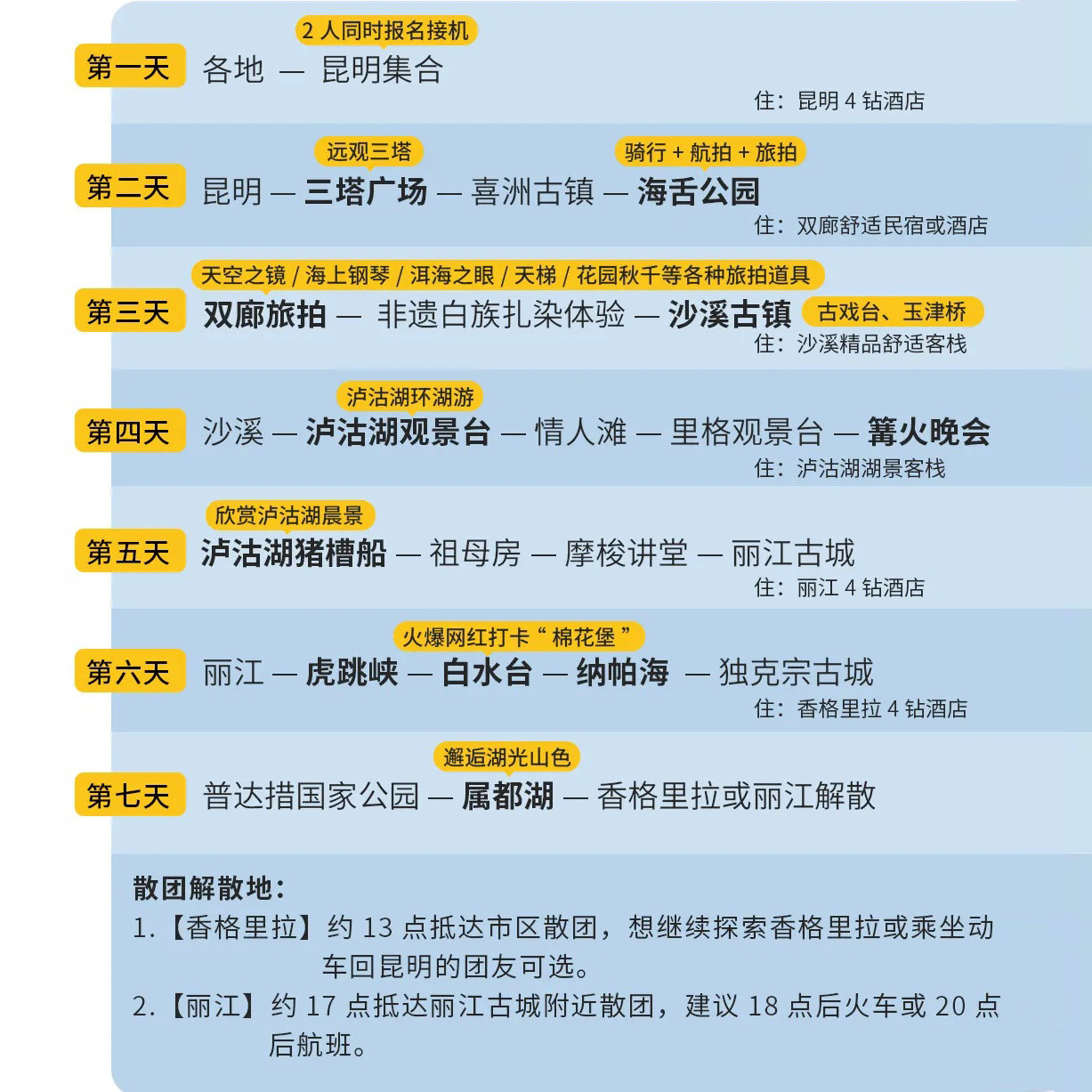 从抵达昆明起即享24小时接站(2人以上免费)、每日矿泉水补给、旅游意外险全覆盖,4人以上更享双程接送。这些细节显著减少差旅者在陌生环境中的协调负担——无需自行打车找路、不必操心基础保障。尤其适合首次赴滇的商务客,将精力集中于核心行程而非琐碎事务,实现真正的“拎包即走”式高效度假。