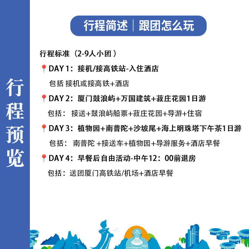 专为时间有限的差旅人士设计,4天3晚紧凑而充实:鼓浪屿、菽庄花园、植物园、南普陀寺、厦门大学等标志性景点一网打尽。每日行程节奏合理,既有文化探访,又有自然风光,避免冗长奔波。高效利用周末或短假期,满足商务人士在有限时间内深度体验厦门魅力的需求。