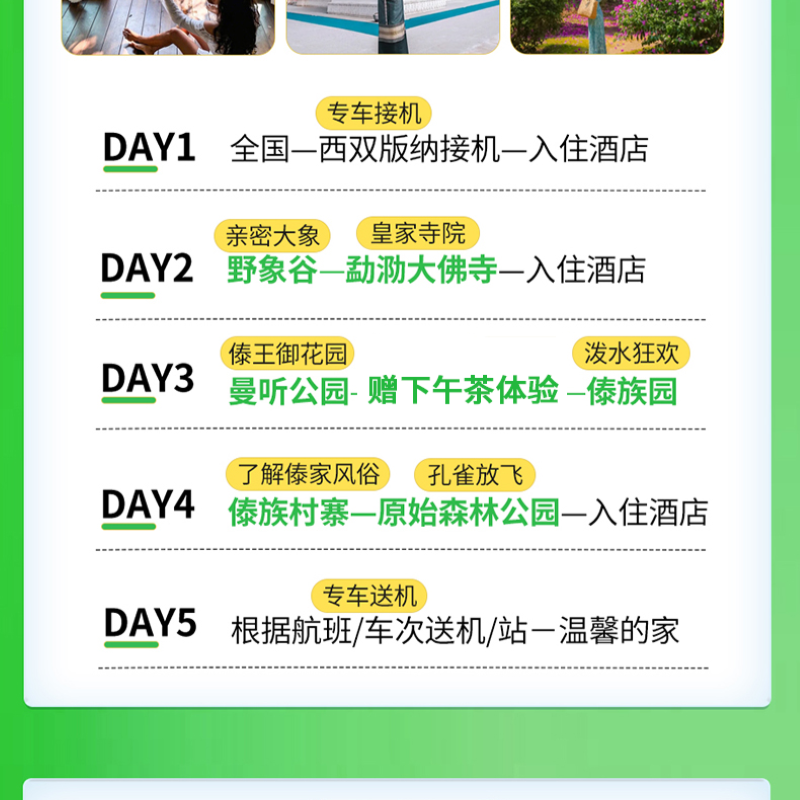 本行程采用【私家独立团】模式,专为注重隐私与效率的差旅人士设计。无需拼团等待,全程专属用车与导游服务,可根据您的会议或工作安排灵活调整每日出发时间。5天4晚的行程节奏张弛有度,既能高效完成公务,又能沉浸式体验西双版纳热带风情,真正实现“工作度假两不误”。