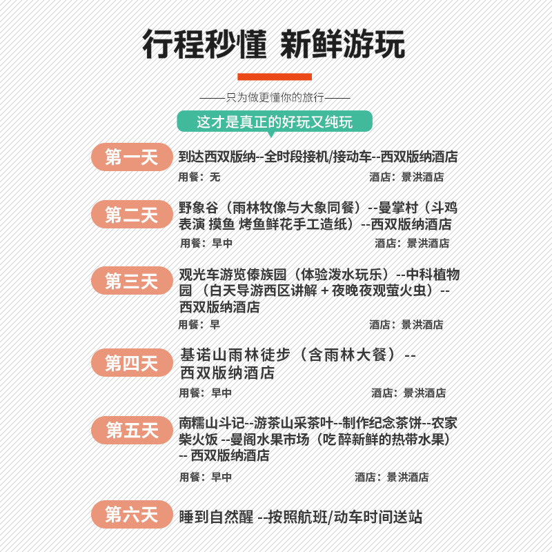 对于常出差的父母而言,陪伴是最奢侈的礼物。本产品以“1人可订”降低出行门槛,6天5晚行程涵盖雨林生态、傣族文化、茶山实践三大主题。无论是参与泼水节的欢乐,还是在植物园里辨识奇花异草,都能创造独特亲子回忆。西双版纳完善的差旅基础设施,更确保您的商务需求不受影响。