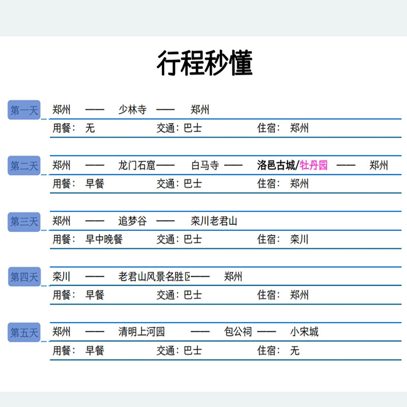 全程采用郑州起止闭环路线,覆盖洛阳、开封、登封三地,避免重复折返,极大提升差旅效率。专业导游全程陪同,交通、门票、住宿一价全含,免除自行规划的琐碎与不确定性。商务人士只需专注核心事务,其余交由专业团队打理,真正实现‘拎包即走、安心度假’的差旅新体验。