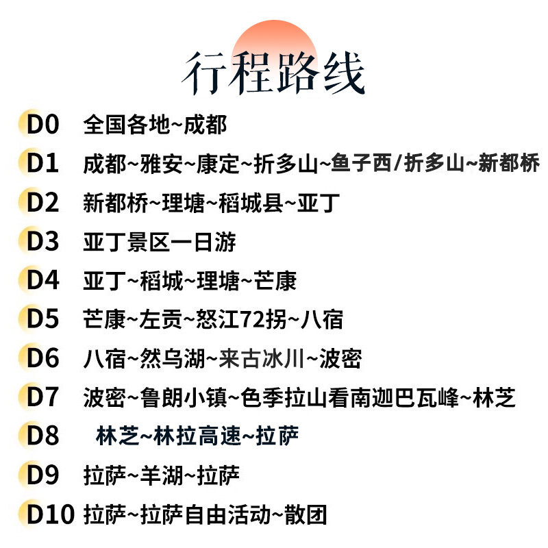 本线路专为差旅人士设计,支持1人单独报名成团,无需等待凑齐多人,极大提升出行效率。从成都出发,10天深度穿越川藏线,既可满足短期商务差旅后的放松需求,又能无缝衔接高原度假体验。5人精品小团配商务车,确保舒适性与私密性,让您的差旅之行兼具效率与诗意。