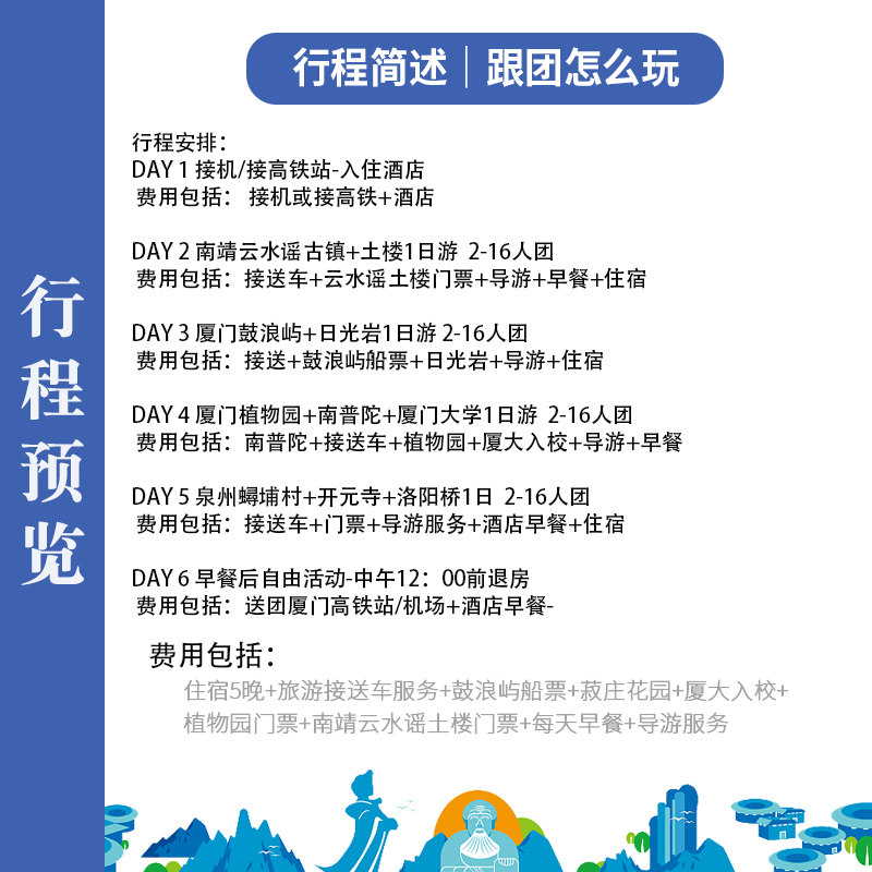 无论您是独自出差还是临时起意顺道度假,本产品支持1人即可成行,无需拼团等待,极大提升差旅自由度。行程涵盖厦门鼓浪屿、厦大、泉州老城区及漳州南靖土楼等精华景点,让单人出行也能享受完整闽南文化之旅,省心又高效。