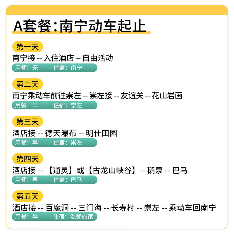 5天行程高效覆盖崇左、百色、河池、南宁四大区域,将德天瀑布、通灵大峡谷、古龙山峡谷、鹅泉、百魔洞、三门海等精华景点一网打尽。特别适合利用周末+年假拼出的小长假出行,或在区域差旅任务完成后顺道深度游览,最大化利用有限假期,实现工作与度假的完美平衡。