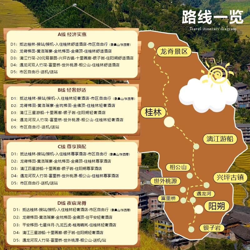 行程整合‘乘船游漓江’‘坐竹筏遇龙河’‘梯田观光’‘古村古镇探访’四大标志性体验,形成完整的桂林文化地理认知闭环。对于首次到访广西的差旅人士,无需自行规划路线,即可高效领略当地自然与人文精髓。这种主题化设计节省决策成本,让差旅度假更省心、更充实。