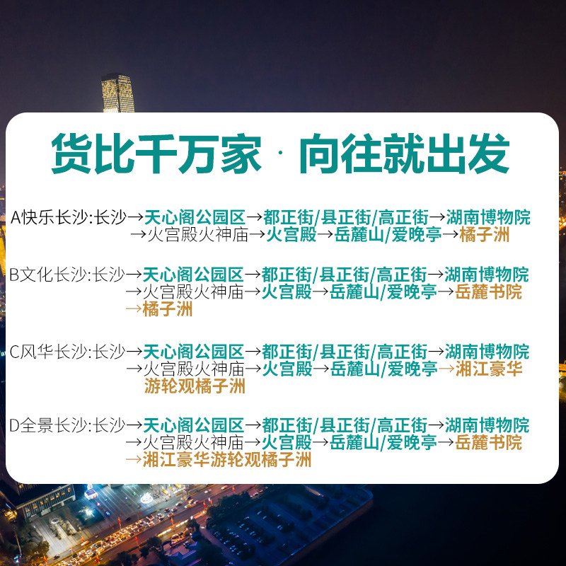 本行程以“长沙经典全景”为主题,精准覆盖外地游客最想体验的四大元素:历史(博物馆)、美食(火宫殿)、山水(岳麓山)、夜景(湘江游轮)。差旅人士往往时间有限,难以自行筛选有效信息,而此产品已由本地专家优化动线,确保在一天内高效打卡所有代表性体验,避免遗漏遗憾,真正实现‘来一次,全体验’的差旅目标。