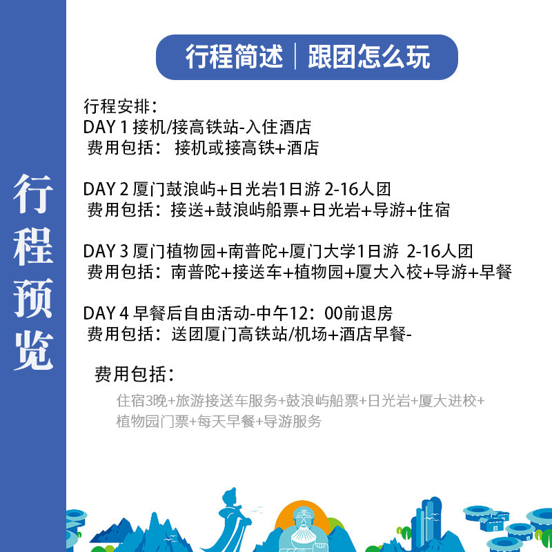 本行程支持1人单独预订,无需拼团等待,极大提升了差旅人士的时间灵活性。无论是临时出差顺道放松,还是独自一人开启短暂假期,都能即订即走。行程安排紧凑高效,4天3晚涵盖鼓浪屿、厦门大学、植物园等核心景点,兼顾工作与休闲需求,让差旅不再单调,而是成为一次身心充电的精致体验。