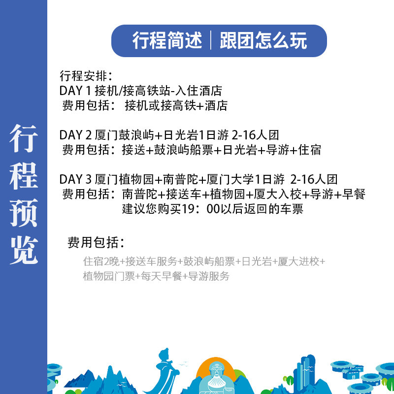 本行程支持1人独立预订,无需拼团等待,特别适合商务人士或独自出差后顺道度假的旅客。无论您是临时调整差旅计划,还是希望在工作之余快速开启一段轻松旅程,都能即订即走。三天两晚的紧凑安排,兼顾鼓浪屿、厦门大学、南普陀寺等核心景点,最大化利用有限假期,实现高效差旅与休闲度假的完美融合。