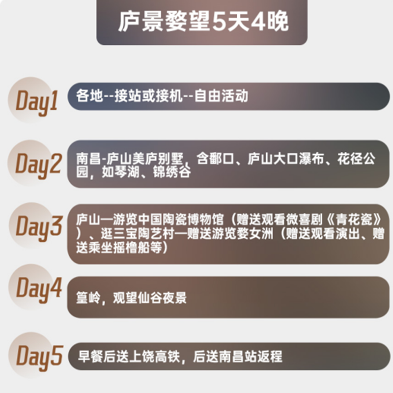 专为职场人士设计的5日行程,节奏张弛有度,既覆盖庐山、景德镇、婺源、望仙谷、三清山五大核心景点,又避免过度赶路。每日车程合理控制,住宿安排便捷,确保差旅者能在有限假期中高效完成一次深度文化之旅。尤其适合利用年假或调休出行的商务人群,实现“短时长、高价值”的度假目标。